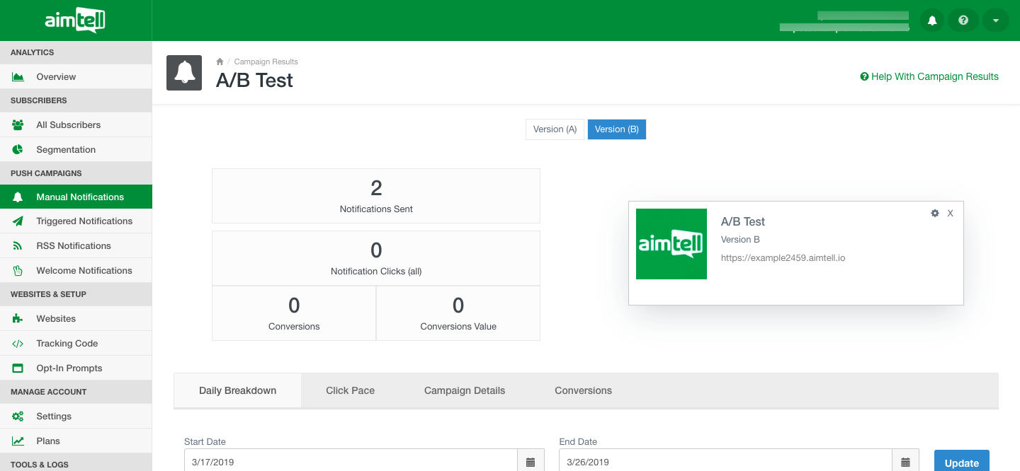 Once your notification campaign has been sent, you can view the results by going to your Manual Campaigns page and clicking 'View Results'. From here you can see how your campaign performed. To toggle between the results of Version A and Version B, just click on which version you would like to view at the top of the page.