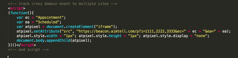 If someone completes the action "Appointment" "Scheduled" on (4444) newsite.com, that information might be valuable on all the others so you can segment them out accordingly. As a result, you can modify your pixel to pass the event back to all the other sites like the following image. Notice the pixel is very much the same as before, with the exception that you are passing a comma separated list of website ids you wish to track this event back to.