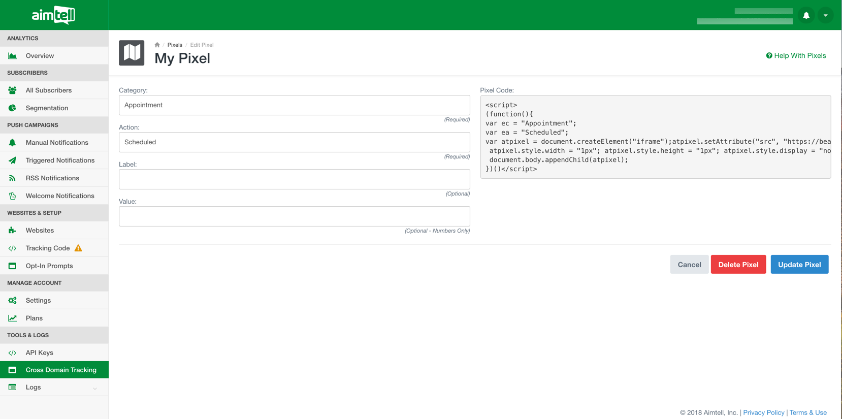 Say you want to send a push notification to your subscribers on yoursite.com, but they will fill out a form / purchase an item on an entirely different domain - schedule.yoursite.com. Furthermore, assume in this example Aimtell is installed on yoursite.com but not schedule.yoursite.com.