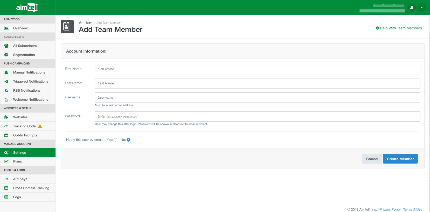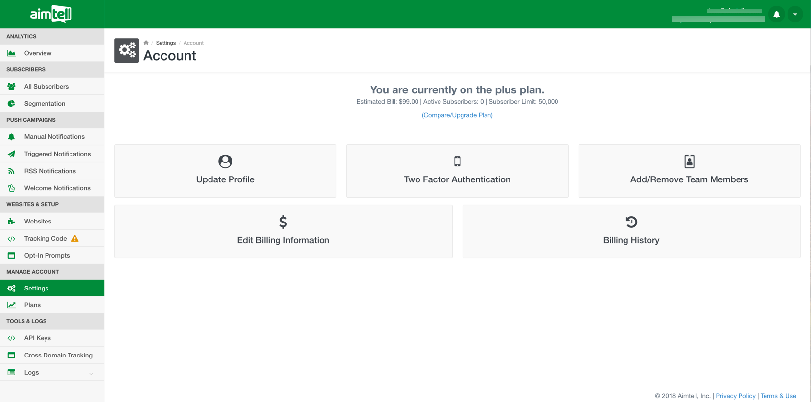 Start off by logging into your Aimtell account and opening your dashboard. From there, click on ‘Settings’ located in the navigation bar on the left side of the screen. Selecting ‘Settings’ will take you to a page with five options- ‘Update Profile,’ ‘Two Factor Authentication,’ ‘Add/Remove Team Members,’ ‘Edit Billing Information,' and 'Billing History'. Select ‘Add/Remove Team Members.’