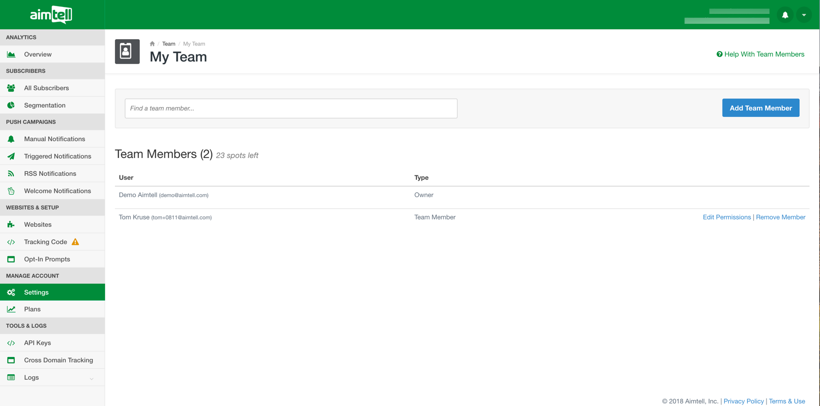 If you have any questions regarding team members, please feel free to reach out to support@aimtell.com