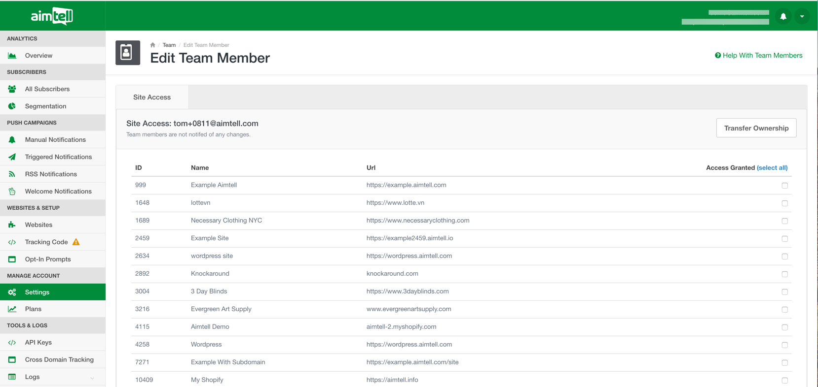 Additionally, if you have multiple websites under your Aimtell account you can decide which team members have access to which websites. Team members may have access to just one, multiple, or all of your websites. From your ‘My Team’ dashboard (from your Dashboard select ‘Settings’ and then Add/Remove Team Members’), selecting ‘Edit Permissions’ for a particular team member will pull up a list of your websites.