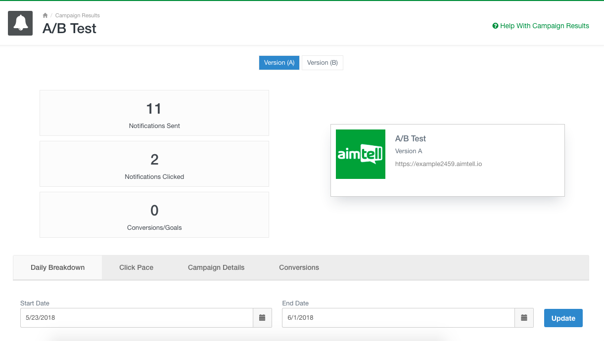 Once your notification campaign has been sent, you can view the results by going to your Manual Campaigns page and clicking 'View Results'. From here you can see how your campaign performed. To toggle between the results of Version A and Version B, just click on which version you would like to view at the top of the page.