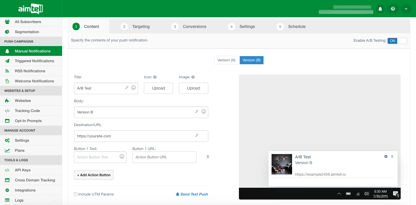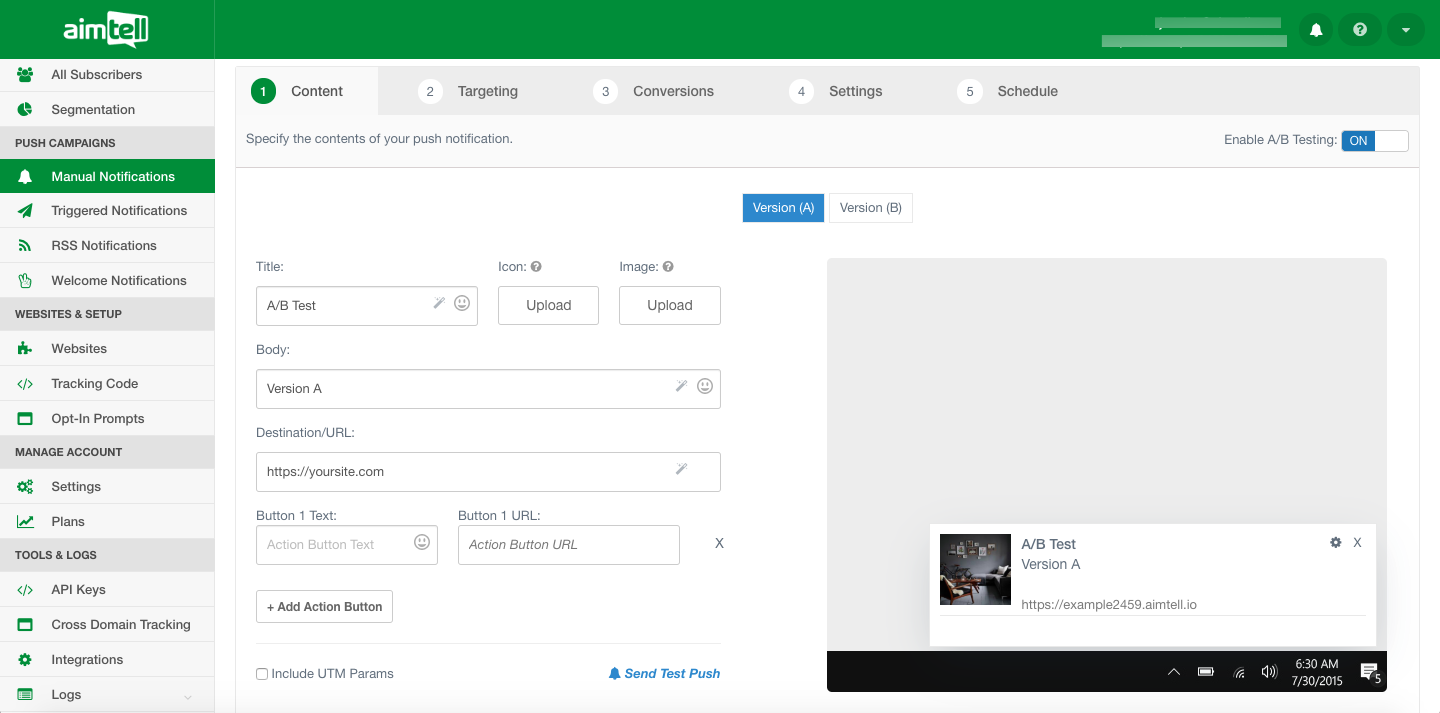 As you probably already know, A/B testing involves testing two versions of something in order to see which performs better. In this case, you are now able to test two versions of a web push campaign to see which performs better- which may be an improved click through rate or increased conversion rate. All you have to do is create two versions of a campaign and choose your segments. We will handle splitting your campaign 50/50 across the users you are sending to in order to run the test.