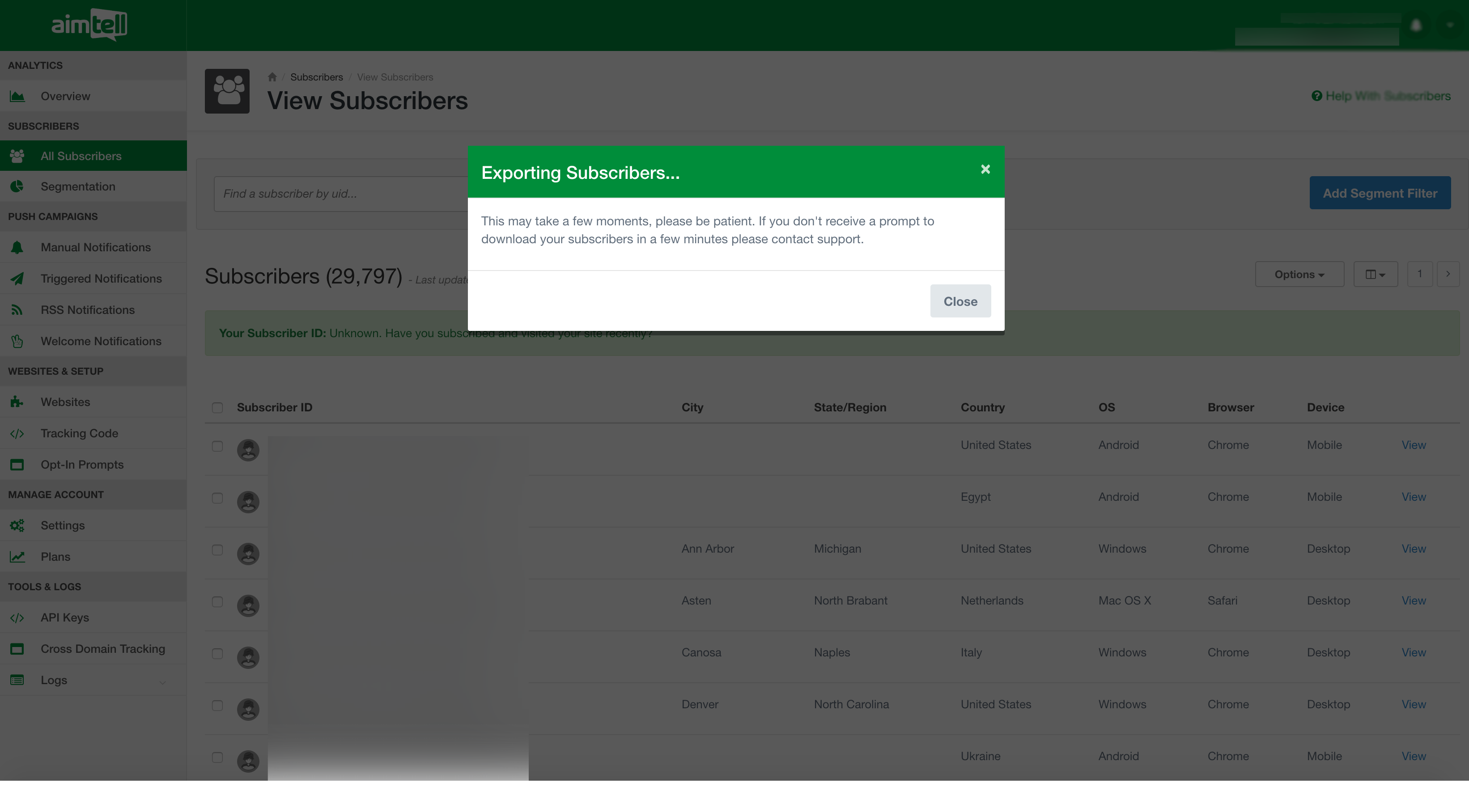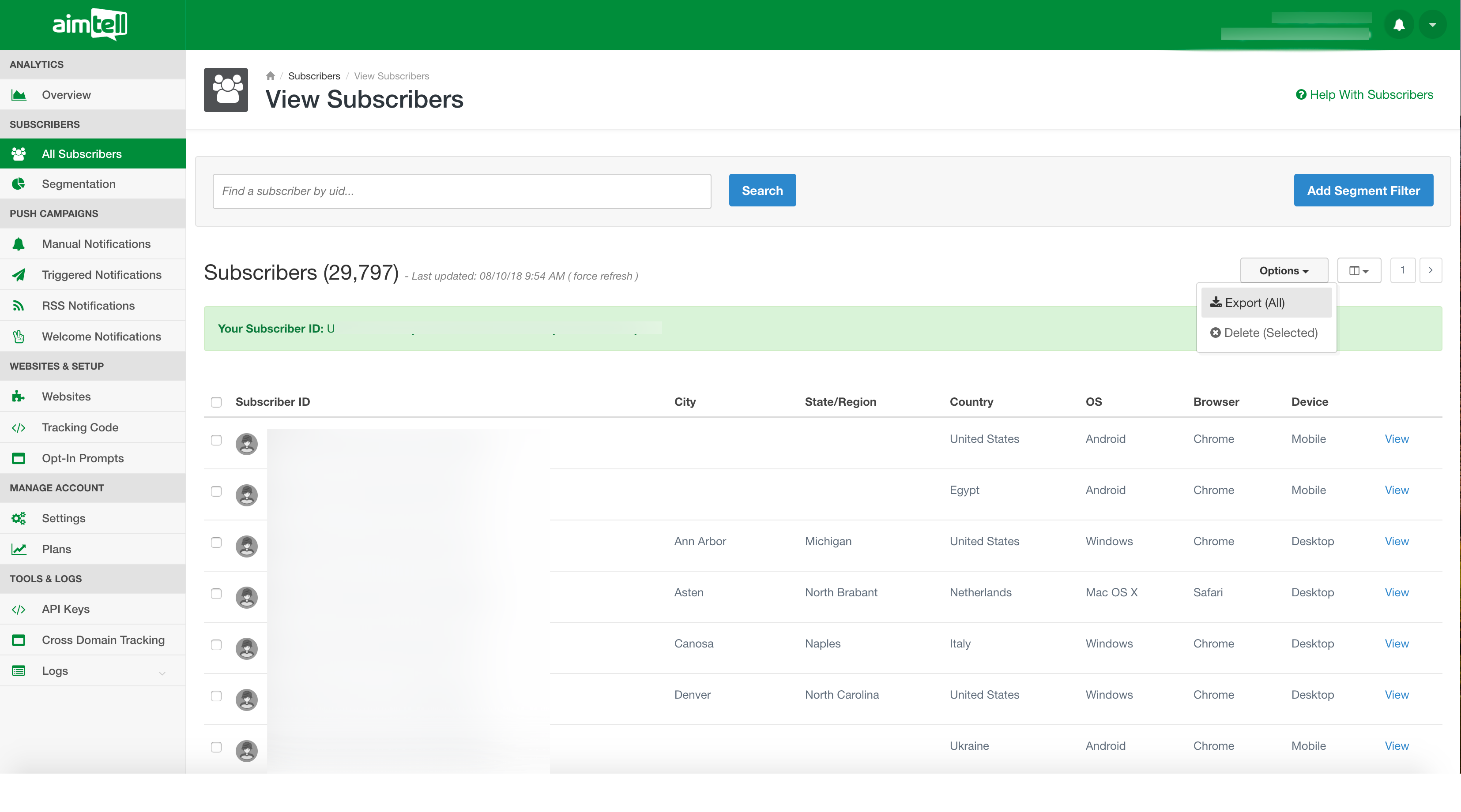 You will then be redirected to your export page, where you can download your subscriber list containing all applicable information including subscriber id, geolocation, custom attributes, push subscriptions, subscriber FCM / GCM / VAPID keys, etc.