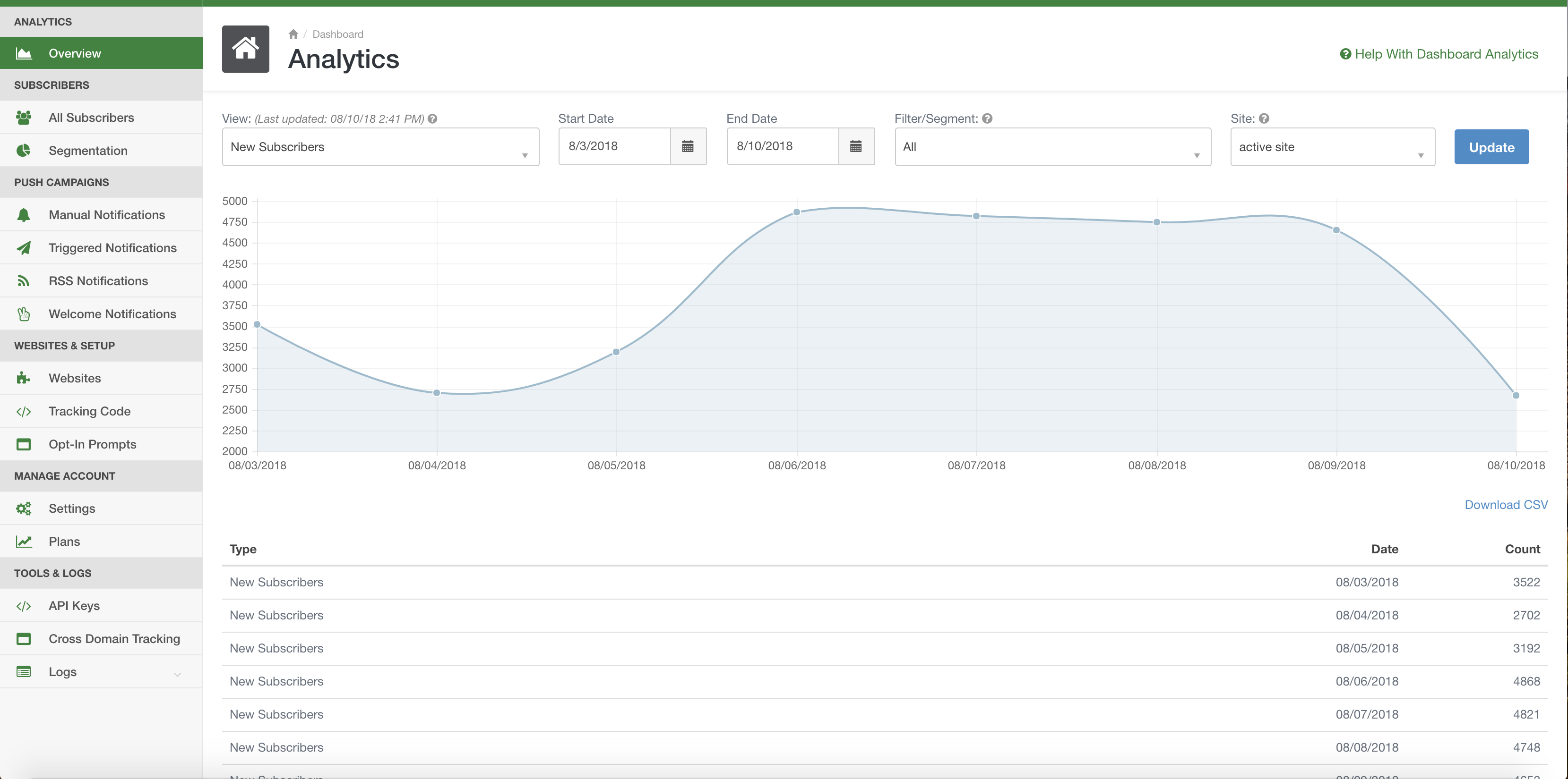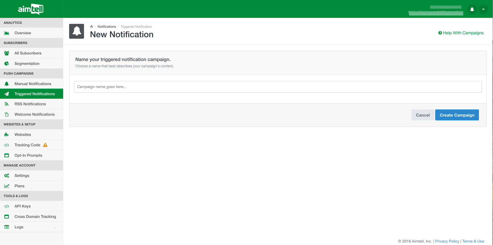 To create a new campaign, hit the ‘New Triggered Notification’ button. This will allow you to set up a new triggered campaign for a particular subscriber action. Give the campaign a name and hit ‘Create Campaign.’
