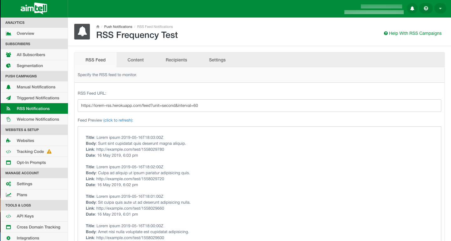 After you’ve found your RSS feed, log into your Aimtell Dashboard and head to RSS Notifications. Click “ New RSS Notification” and enter a name for your RSS Notification Campaign.