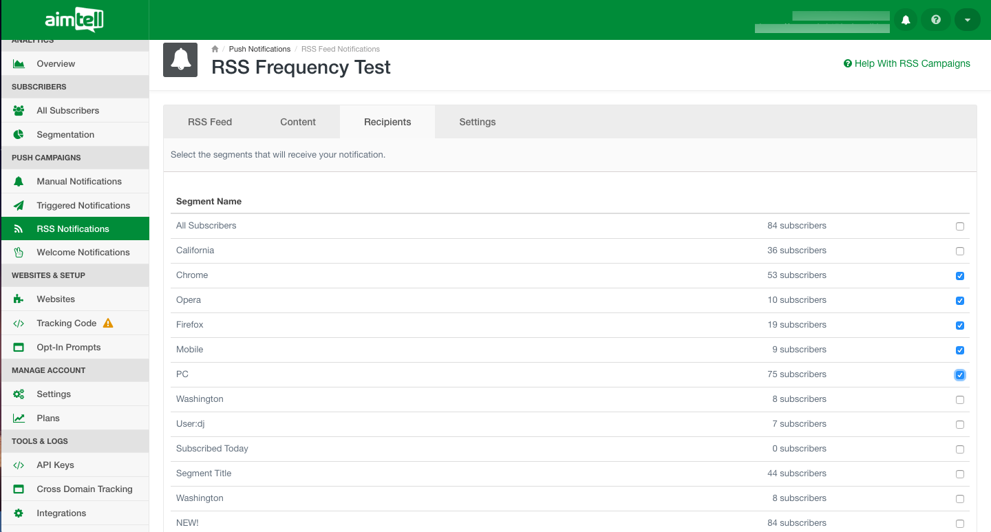 Much like manual push notification campaigns, RSS campaigns can be directed to any segment you’d like. You may select as many segments as you want, but must at least set 1 in order to activate the campaign.