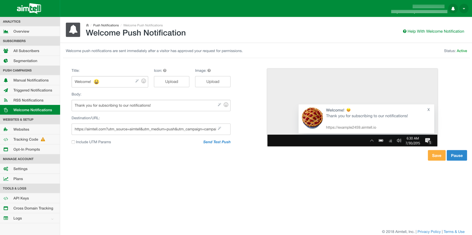 Start off by logging into your Aimtell account and opening your dashboard. From there, select ‘Welcome Notifications.’