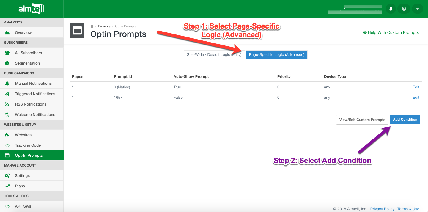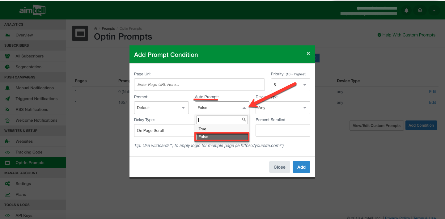 Change the Auto Prompt field to "false" and then click add condition. Now the condition is active and your Opt-In prompt will not be displayed on the pages that you have chosen.