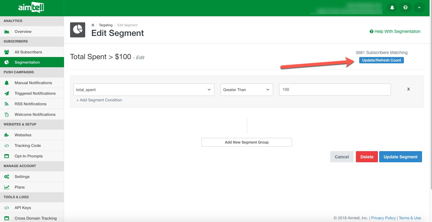 While our ultimate goal is to provide near real-time subscriber counts for both segments and total subscriber counts, this is quite an ambitious goal given the volume of data points collected by Aimtell every day.