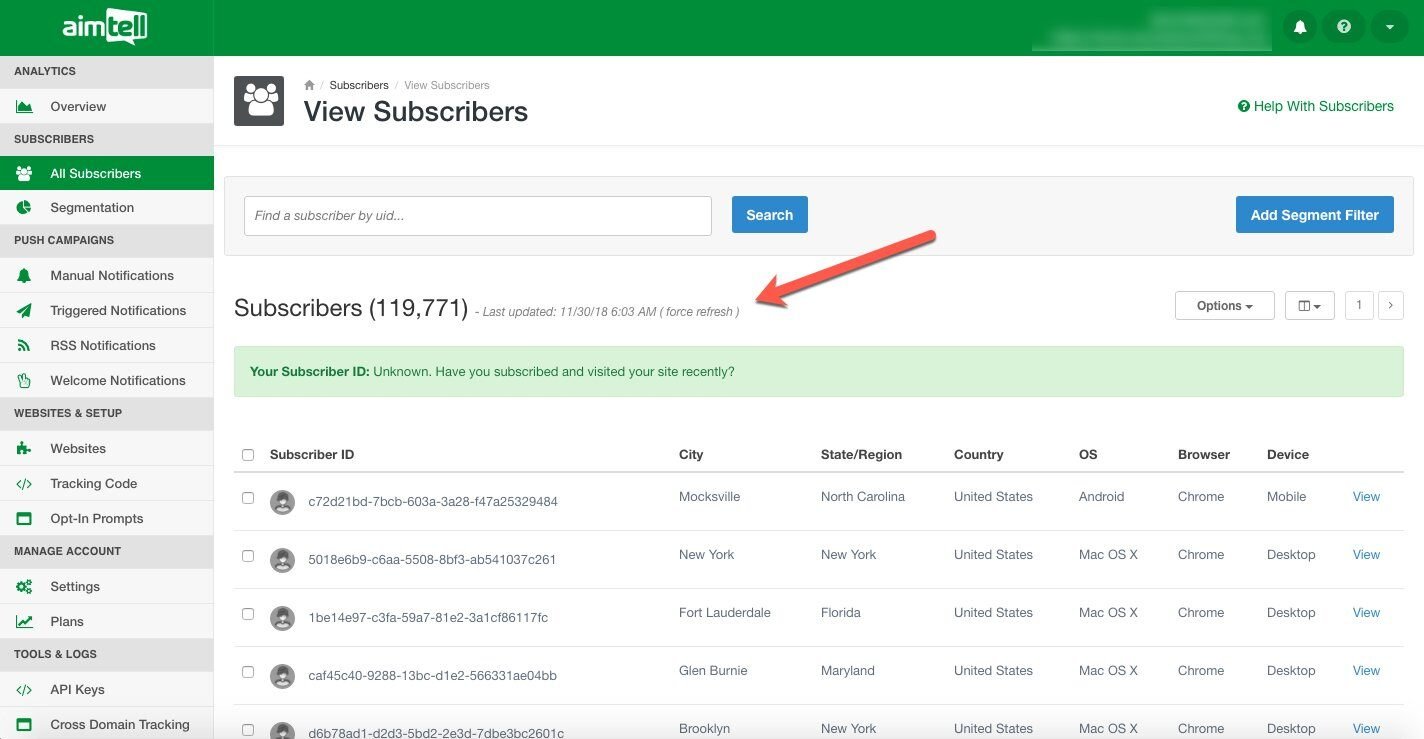 The first method is done by heading to All Subscribers and then clicking "force refresh."
