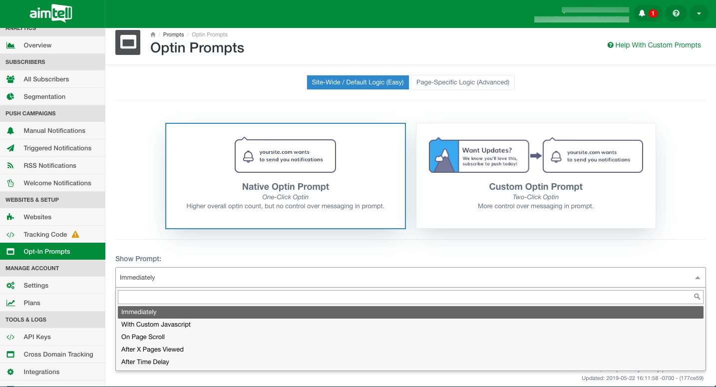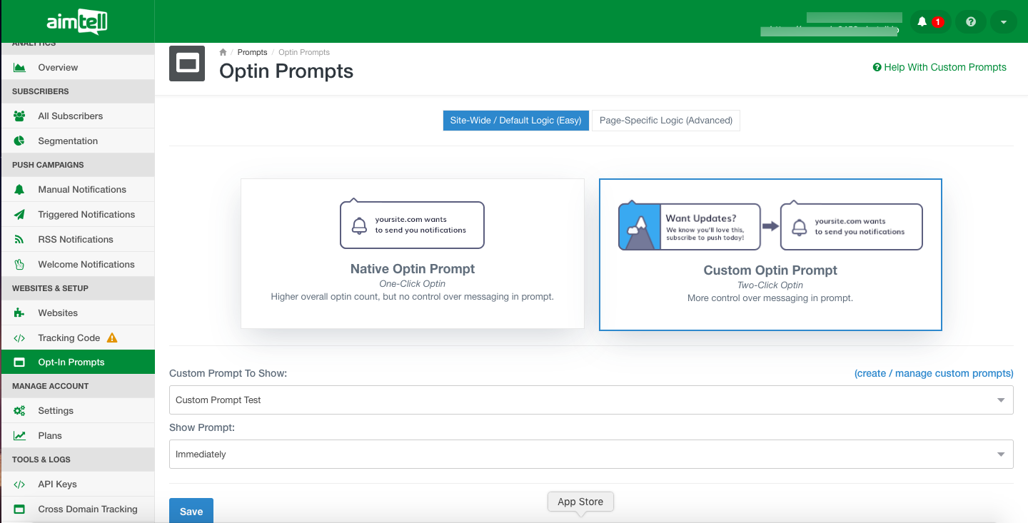 On your Aimtell dashboard select ‘Opt-In Prompts’, located in the navigation bar on the left side of the screen under ‘Websites & Set Up’.