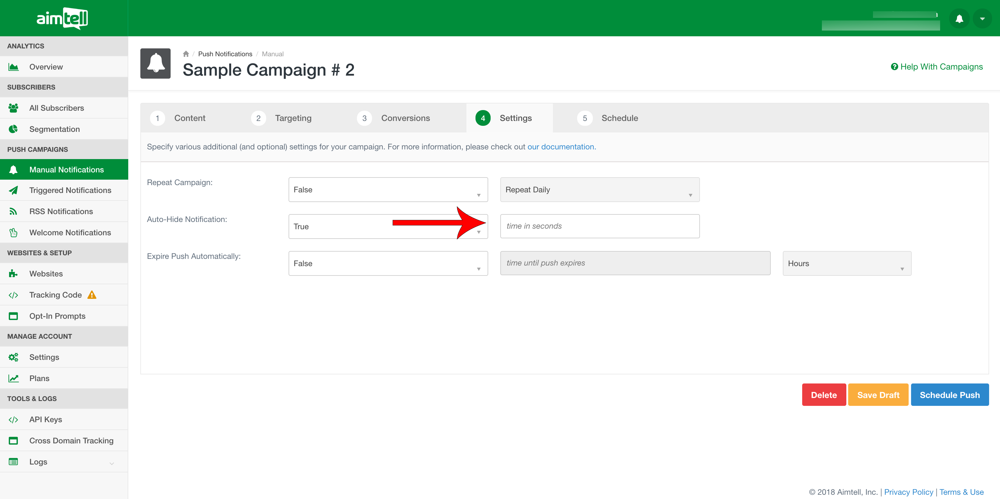 To find this feature, click on the 4th tab labeled 'Settings' when creating your manual notification campaign. With the Auto-Hide Notification setting, you can choose how long your notification will stay on your subscribers screen before it disappears. Just change the corresponding drop down to 'True' and then type in the number of seconds you wish your notification will be shown for your subscriber.