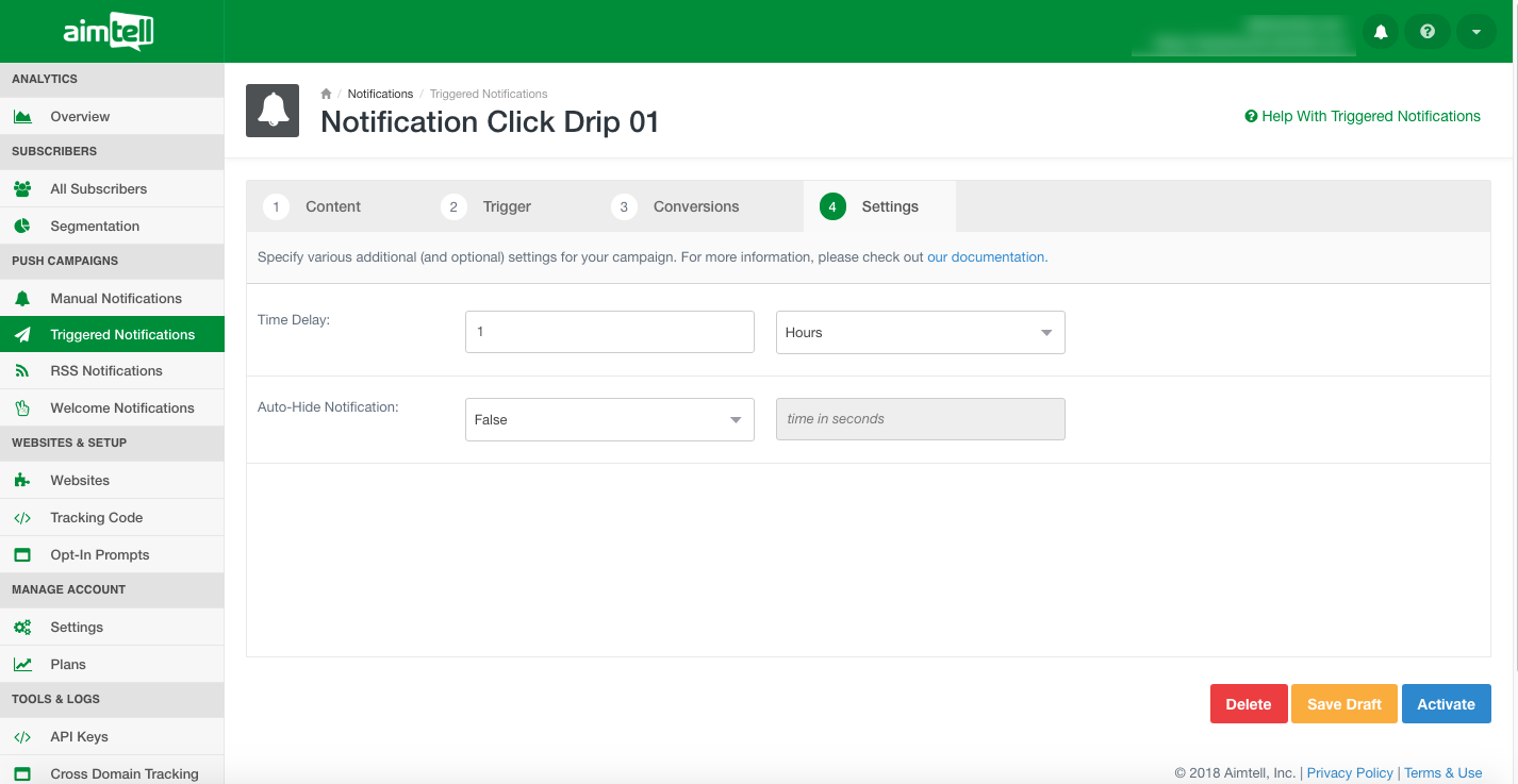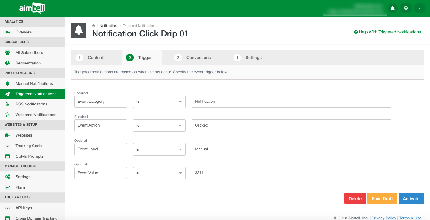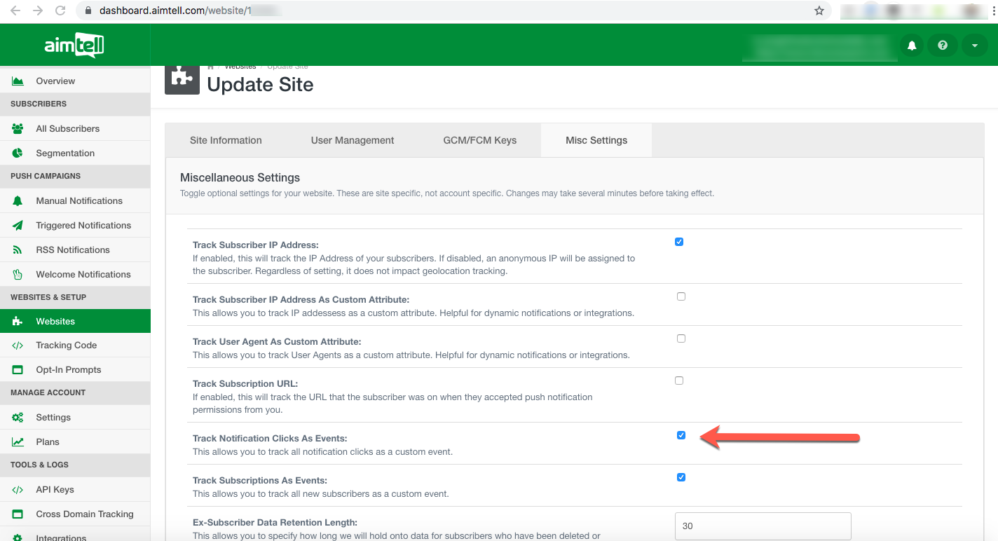 As you may already be aware, Aimtell offers you to optionally enable various tracking points for your site within the Website Settings section. In order to properly set up a Notification Drip Notifications, you'll need to make sure that you've enabled the 'Track Notification Clicks as Events' option for your website.