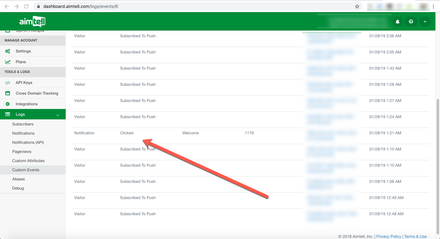 After you've enabled that, you'll start seeing your Event Logs fill in with the custom event of "Notification" "Clicked". If you don't see these immediately, that's ok. It often can take up to 5 minutes for the update to kick in and start tracking the event.