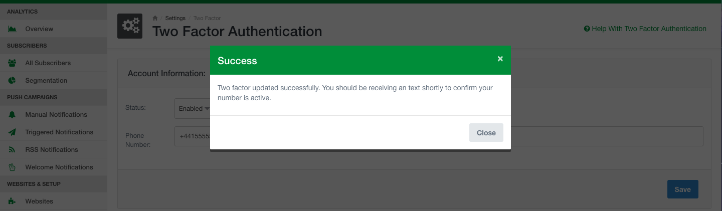 Once you have enabled 2FA and added your phone number, click on 'Save' at the bottom right. You will see this message that your account is now set up for 2FA and you should be receiving a text message on your phone as confirmation.