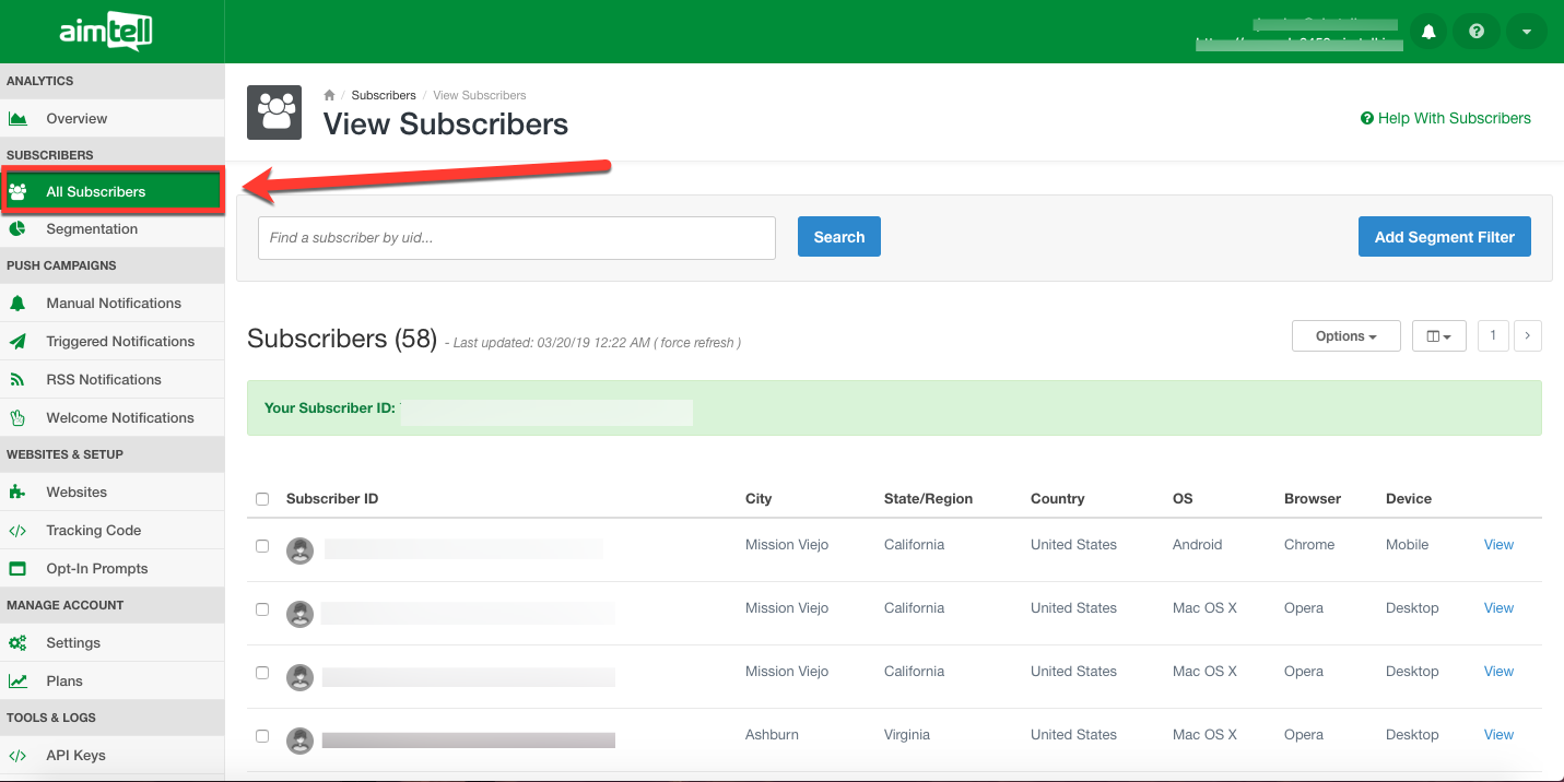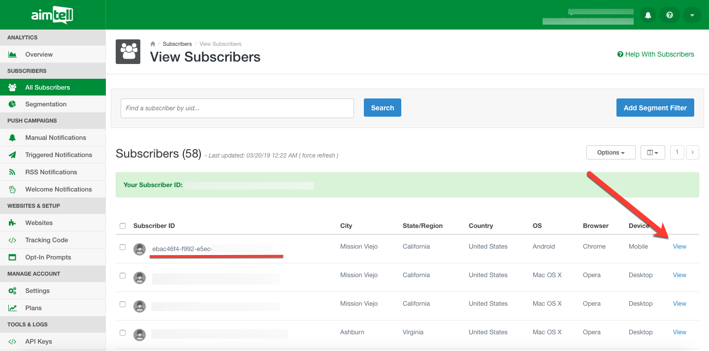 You can view detailed information about any listed subscriber by clicking on "view" on the far right hand side, next to the 'Device' column.