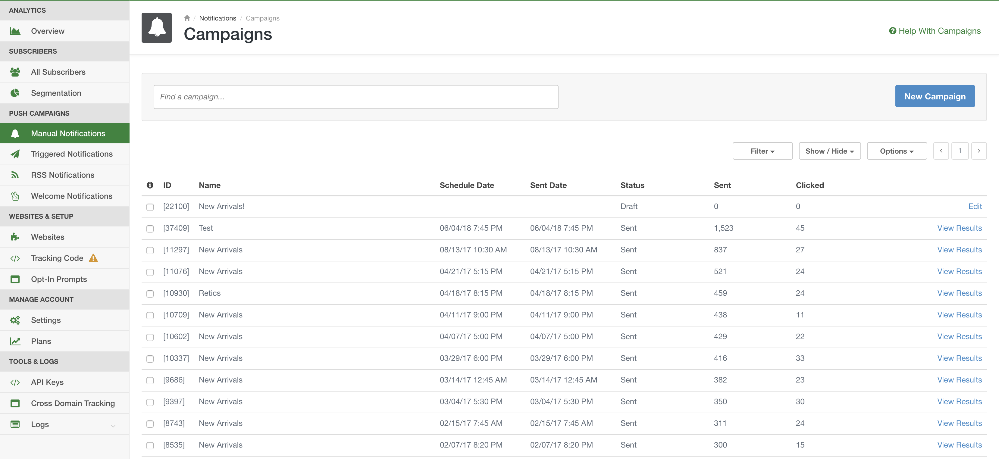 To view the results of a campaign head to the sidebar and select the type of campaign you want to see results for- manual notifications, triggered notifications, RSS notifications, or your welcome notification.